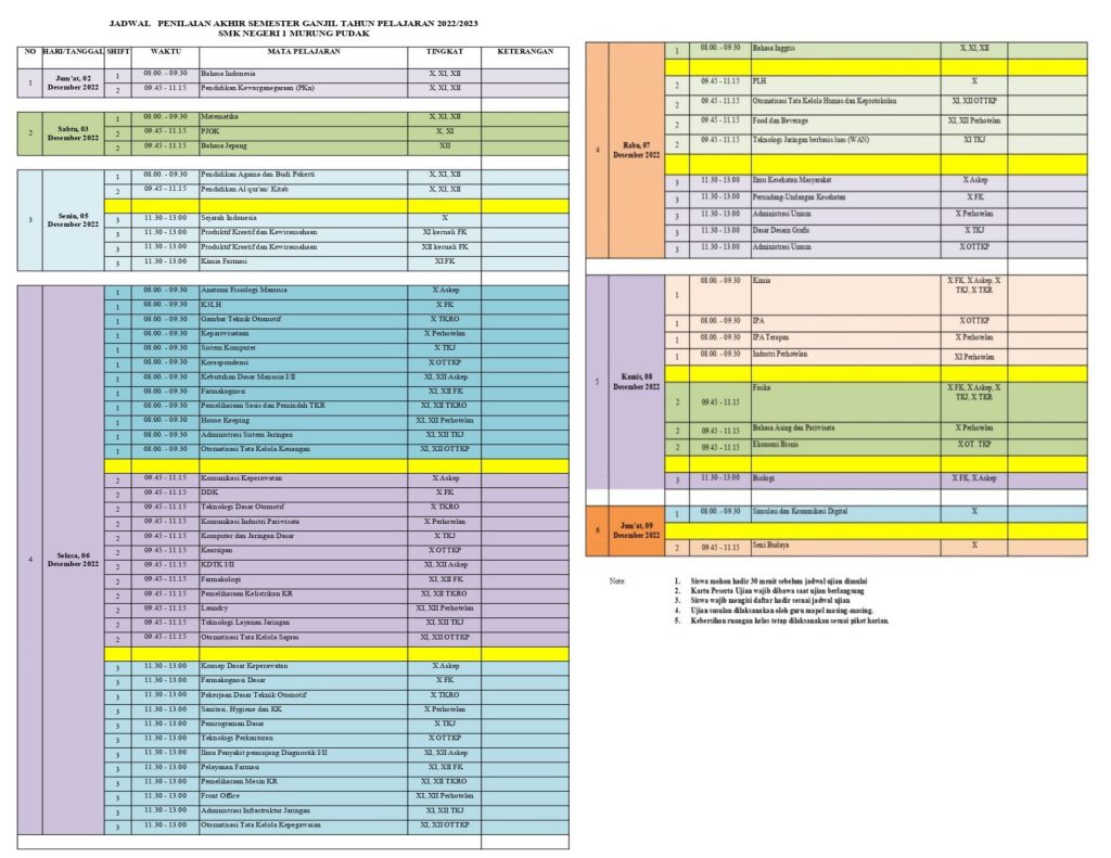 Penilaian Akhir Semester (PAS) Ganjil Tahun Pelajaran 2022/2023 di SMK Negeri 1 Murung Pudak dilaksanakan pada 2 Desember – 9 Desember 2022, dimulai pukul 08.00 – 13.00 WITA. PAS Ganjil tahun ini menggunakan tablet atau hp dengan Google Form Quiz. PAS Ganjil tahun ini diikuti seluruh siswa kelas X, XI, dan XII semua kompetensi keahlian dengan jumlah total siswa 840 siswa.